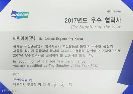 而今年3月,IMI关键流体技术事业部韩国团队,就因为过去一年高效的生产和优质的产品,以及响应快速的服务,被斗山重工评选为“2017年度供应商”。