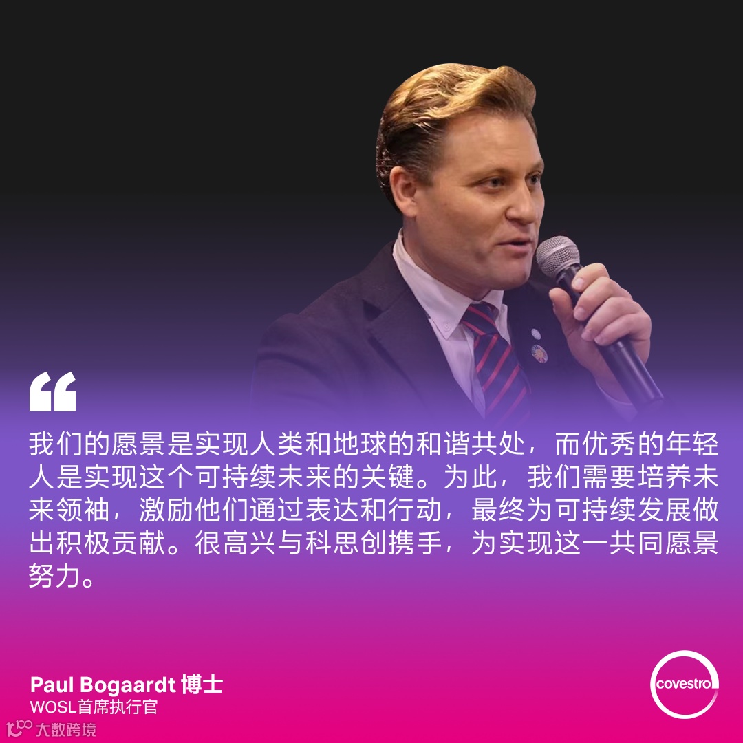 战略合作主要围绕联合国可持续发展17项目标展开。科思创将进一步与WOSL携手通过联合国可持续发展青少年大使项目之一的主题绘画及演讲比赛,帮助青少年树立可持续发展观念,使其成为倡导可持续未来的主力军和未来领袖。