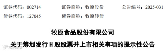A股上市公司,全球最大的生猪养殖和猪肉生产商之一牧原股份(002714.SZ)宣布,为深入推进国际化战略,打造国际化资本运作平台,经充分研究论证,公司拟发行境外上市外资股(H股)股票并申请在联交所主板挂牌上市。