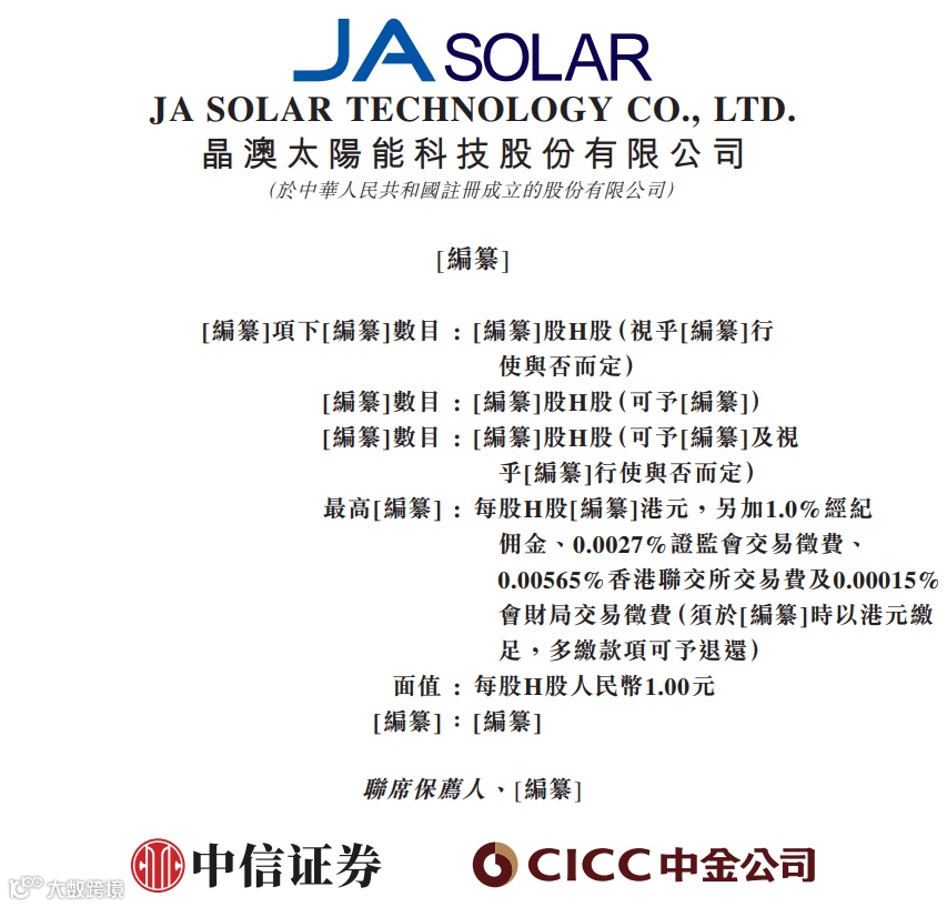 据港交所4月28日披露,晶澳太阳能科技股份有限公司(002459.SZ)递表港交所主板,中信证券、中金公司为联席保荐人。
