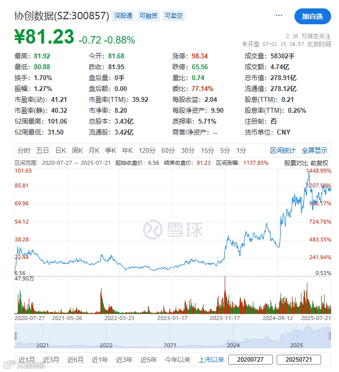 协创数据(300857.SZ)于2020年7月27日在A股上市,目前市值约278.91亿元人民币。