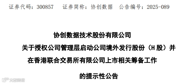 来自广东深圳的A股上市公司协创数据(300857.SZ)周一(7月21日)发布公告称,为进一步拓展公司的国际化战略,优化海外业务布局,增强境外融资能力,打造国际化资本运作平台,提升综合竞争实力,依据公司总体发展战略及运营需要,公司拟在境外发行股份(H股)并申请在香港联合交易所有限公司挂牌上市。
