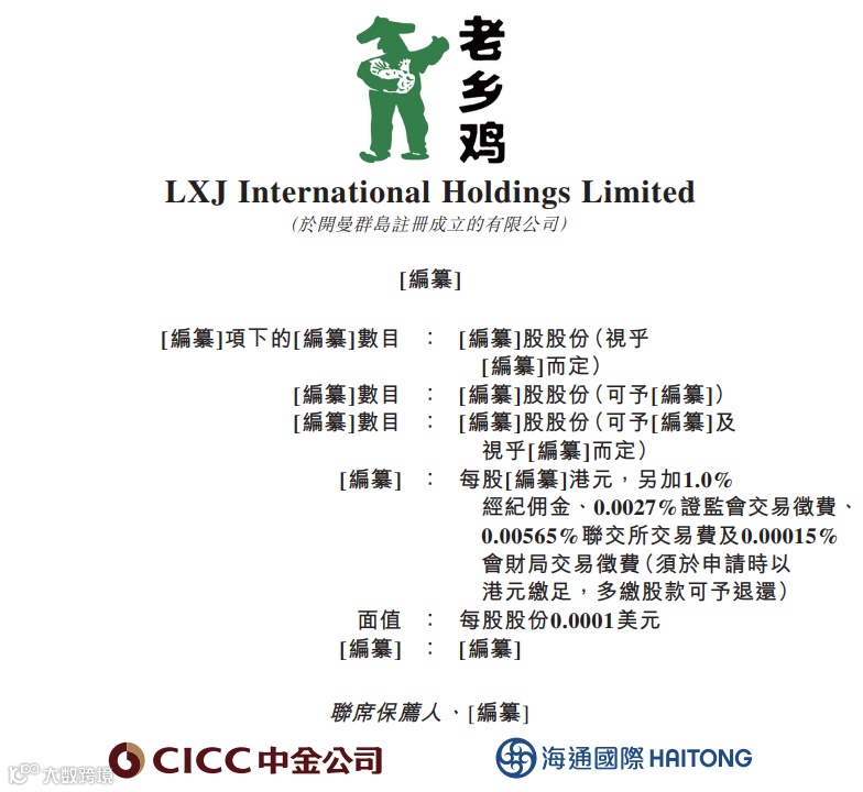 此前,LXJ International Holdings Limited(老乡鸡)递表港交所主板,中金公司和海通国际为联席保荐人,后进一步委任国元证券为整体协调人。