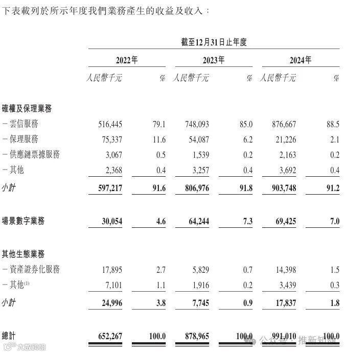 在这三项业务中,公司的确权及保理业务為最主要收入及收益来源,而公司於此业务的大部分服务乃通过公司的云链平台运营。截至2022年、2023年及2024年12月31日,云链平台的用户数量分别為230,434家、372,936家及556,588家。截至2024年12月31日,该等用户位於中国330个或98%的直辖市及地级行政区。该等用户包括核心企业、链属企业及金融机构。截至2024年12月31日,合共6,601家核心企业、546,413家链属企业以及3,574家金融机构已註册為公司的平台用户。