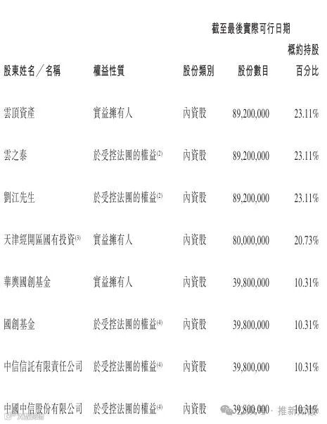 自2021年7月起,云顶资產持有本公司单一最大股权。公司的董事长刘江先生自云顶资產成立以来一直為其实际控制人。截至最后实际可行日期,刘江先生作為有限合伙人直接持有云顶资產的64.79%合伙权益。截至最后实际可行日期,云之泰(由刘江先生拥有80%)為云顶资產的唯一普通合伙人,直接持有云顶资產的0.01%合伙权益。因此,刘江先生、云之泰及云顶资產构成公司的单一最大股东集团。