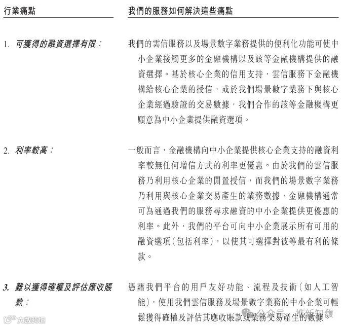 自2015年成立以来,公司的產业数字金融平台-云链,服务核心企业、链属企业及金融机构,致力解决彼等於產业数字金融市场的需求。核心企业主要是指在各自供应链中佔据市场主导地位的大型企业。他们可以通过信用方式向链属企业(主要為中小企业供应商)採购商品及服务,促进金融机构利用其閒置授信及採用数字增信手段向供应商提供金融支持。