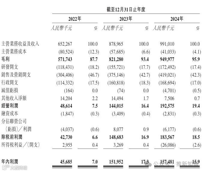 截至2022年、2023年及2024年12月31日止年度,我们的收益及收入分别為人民币652.3百万元、人民币879.0百万元及人民币991.0百万元。我们的盈利能力亦录得可观增长,截至2022年、2023年及2024年12月31日止年度录得除税前利润分别為人民币42.7百万元、人民币148.7百万元及人民币183.6百万元以及年内利润分别為人民币45.7百万元、人民币152.0百万元及人民币157.5百万元。