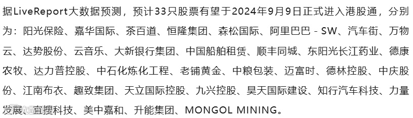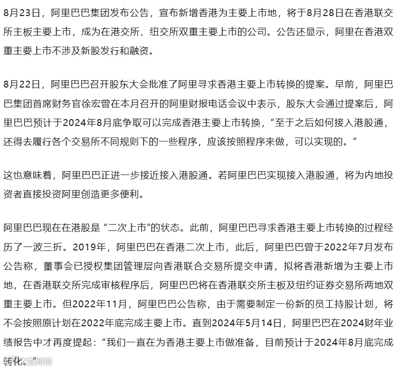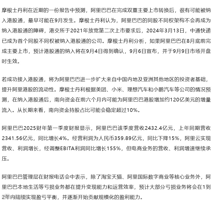 导读:如果阿里巴巴在8月底前完成主要上市,预计港股通的纳入将在9月4日得到确认,9月6日宣布,并于9月9日市场开盘时生效。