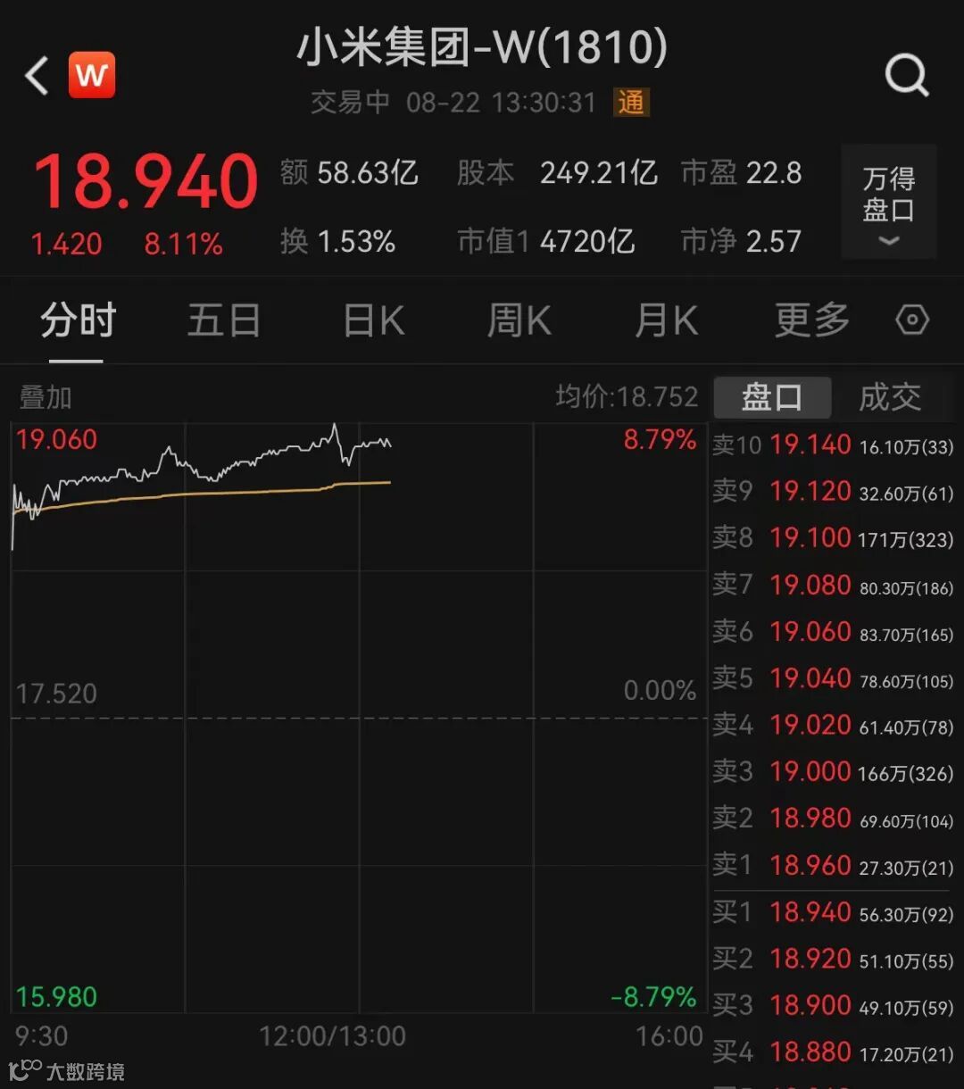 截至今日13点30分,小米集团-W(1810.HK)涨超8%,报18.94港元/股。