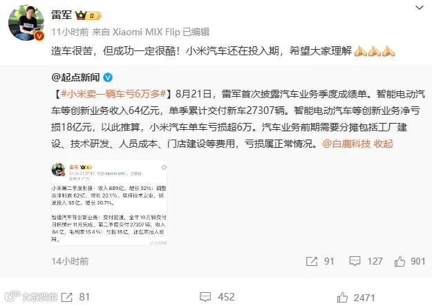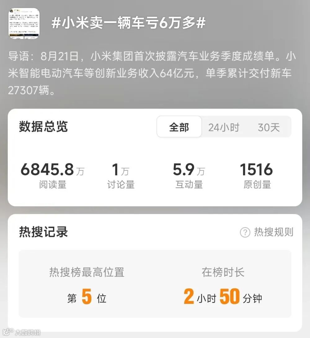 8月22日,话题#小米卖一辆车亏6万多#冲至微博热搜榜第5位,引发关注。