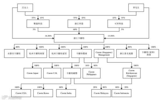 招股书显示,卡罗特在上市前的股东架构中,章国栋、吕伊俐夫妇,分别通过间接拥有45%、55%的Yili Investment,持股98.60%;