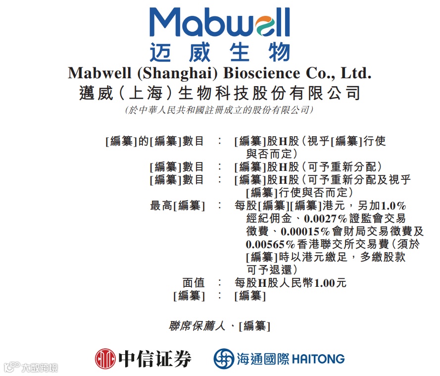 据港交所1月6日披露,迈威(上海)生物科技股份有限公司向港交所主板提交上市申请书,中信证券、海通国际为联席保荐人。