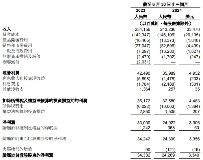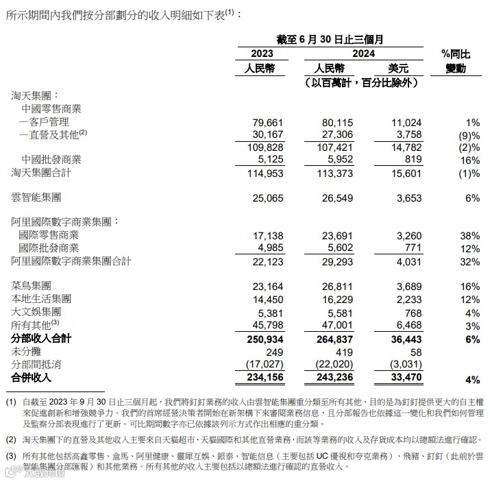 2024年8月15日,阿里巴巴(099880.HK)发布2025财年第一季度(截至2024年6月30日止三个月)业绩公告,财报显示,阿里2025财年Q1收入达2432.36亿(人民币元,下同),同比增长4%。净利润240.22亿元,同比下降27%,按非公认会计准则,净利润为406.91亿,同比下降9%。