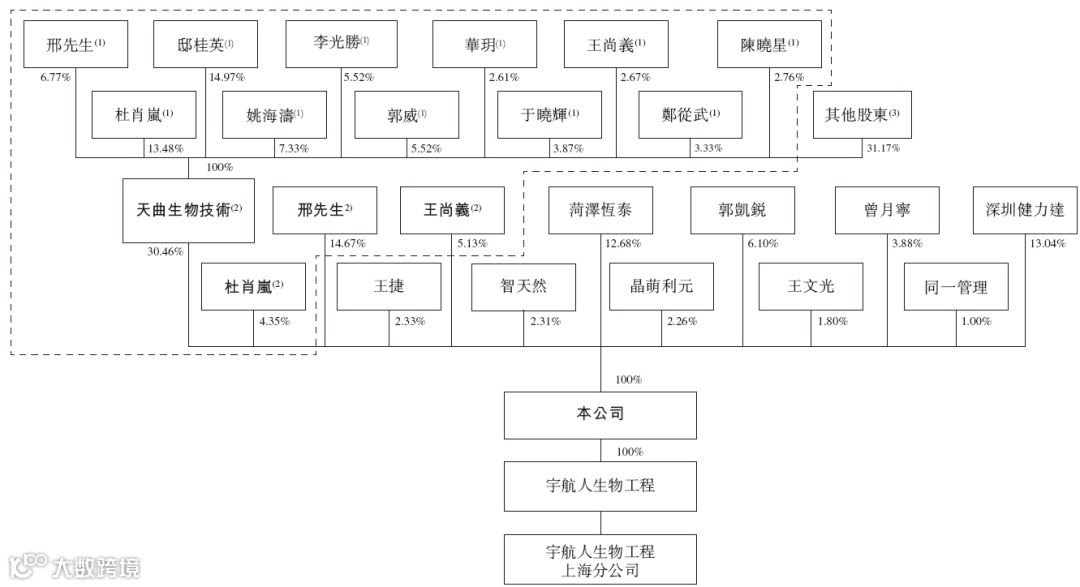 * 天曲生物技术的股东:以邢国良先生意见为准的一致行动股东包括邢国良先生(6.67%)、邸桂英女士(14.97%)、杜肖岚先生(13.48%)、姚海涛先生(7.33%)、李光胜先生(5.52%)、郭威先生(5.52%)、于晓辉先生(3.87%)、郑从武先生(3.33%)、陈晓星先生(2.76%)、王尚义先生(2.67%)、华玥女士(2.61%);其他39名股东持股31.17%,包括杨建标(3.68%)、安堃(2.99%)、奇达拉(1.88%)、王然颖(1.56%)、刘利成(1.47%)、王亚男(1.47%)、李长春(1.44%)、邢国芳(1.20%)、宋晓峰(0.98%)、武剑虹(0.93%)、邢国慧(0.90%)、唐洪光(0.79%)以及其他27名个人股东。
