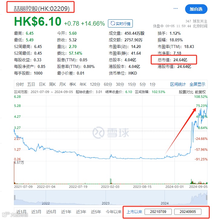 喆丽控股(02209.HK)于2021年7月9日在港交所挂牌上市,当时以每股3.28港元发行价募资1.31亿港元。截至午间收市,其收报6.10港元,较去年最后一个交易日的收盘价0.52港元,涨了1073.1%。