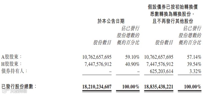 可换股债券初始H股转股价为43.71元,较公司于7月15日收市价36.05元,溢价约21.25%。若债券全部按每股H股43.71港元的初始转换价进行转换,可转换成约6.25亿股H股,占公司经扩大后已发行股本的3.32%。