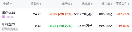 今早开市后两股表现截然相反,截至今日(9月24日)午间收市,名创优品(09896.HK),每股报24.25港元,跌26.29%,总市值约305.38亿港元。永辉超市(601933.SH)今早开盘一字涨停,每股报人民币2.48元,总市值约人民币225.06亿元。