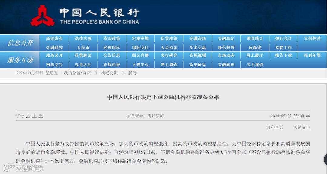 中国人民银行决定:自2024年9月27日起,下调金融机构存款准备金率0.5个百分点(不含已执行5%存款准备金率的金融机构)。本次下调后,金融机构加权平均存款准备金率约为6.6%。