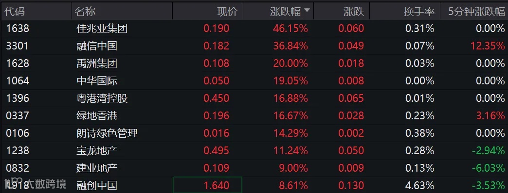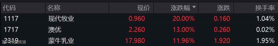 港股高开高走。恒指涨3.2%,恒生科指涨超5.7%。乳制品板块爆发,现代牧业涨20%,蒙牛乳业涨超10%。内房股走强,佳兆业集团涨幅扩大至46.15%。