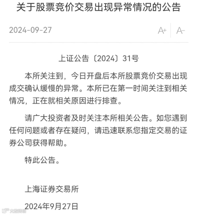 11时左右,上交所公告称,今日开盘后本所股票竞价交易出现成交确认缓慢的异常。本所已在第一时间关注到相关情况,正在就相关原因进行排查。