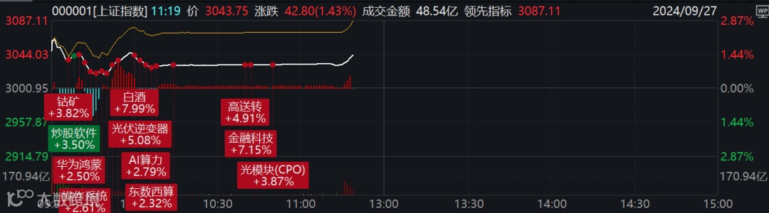 9月27日周五,A股三大指数集体高开。上证指数涨1.43%,深证成指涨5.74%,创业板指涨8.36%超1800点,创历史盘中最大涨幅。