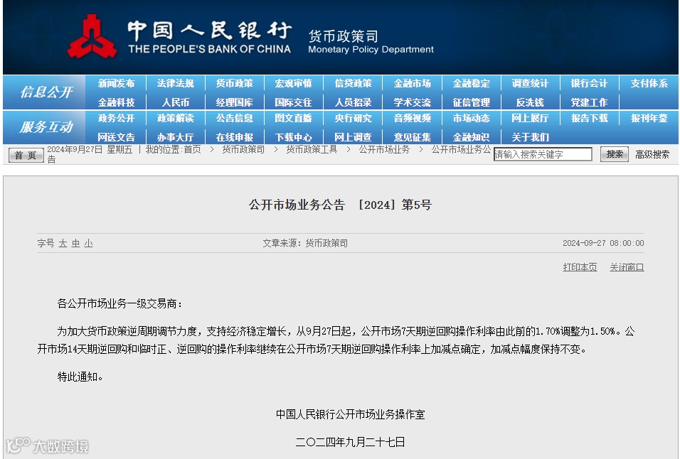 央行同时公告表示,为加大货币政策逆周期调节力度,支持经济稳定增长,从9月27日起,公开市场7天期逆回购操作利率由此前的1.70%调整为1.50%。公开市场14天期逆回购和临时正、逆回购的操作利率继续在公开市场7天期逆回购操作利率上加减点确定,加减点幅度保持不变。