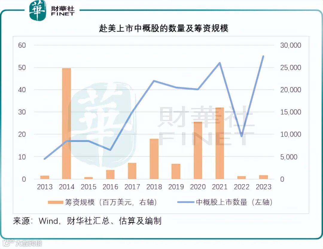 根据Wind数据统计,财华社对2013年至2023年中概股上市情况进行了分析。结果显示,2023年赴美上市中概股数量为55家,较去年的19家显著增加,创下自2013年以来的新高。同时,筹资规模也由去年的6.49亿美元回升至8.32亿美元。然而,与2020年和2021年甚至2014年阿里巴巴(BABA.US)与京东(JD.US)上市时的盛况相比,仍存在较大差距。