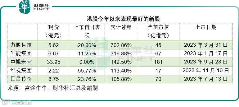 从累计涨幅来看,表现最好的是从事跨境数字营销服务的力盟科技(02405.HK),累计涨幅达7.03倍;第二是从事石墨电极生产的升能集团(02459.HK),累计涨幅3.17倍;第三是从事网络游戏发行的中旭未来(09890.HK),累计涨幅1.43倍;第四是前文提到的华视集团;连周杰伦概念股巨星传奇(06683.HK)也挤进了前五,累计涨幅达1.06倍,见下表。