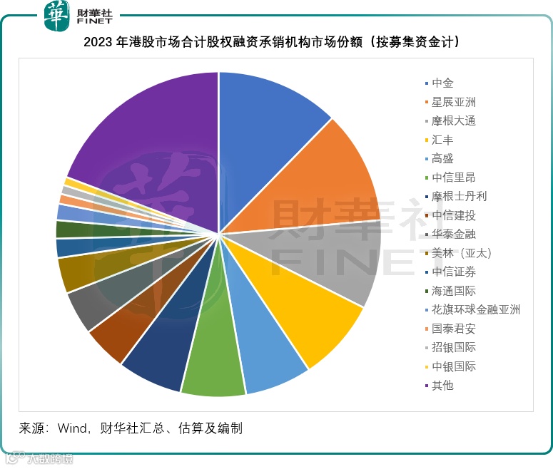 第三、第四和第五分别是外资投行摩根大通、汇丰和高盛(亚洲),募资规模分别为67.02亿港元、62.02亿港元和50.35亿港元,市场份额分别为8.85%、8.19%和6.65%。