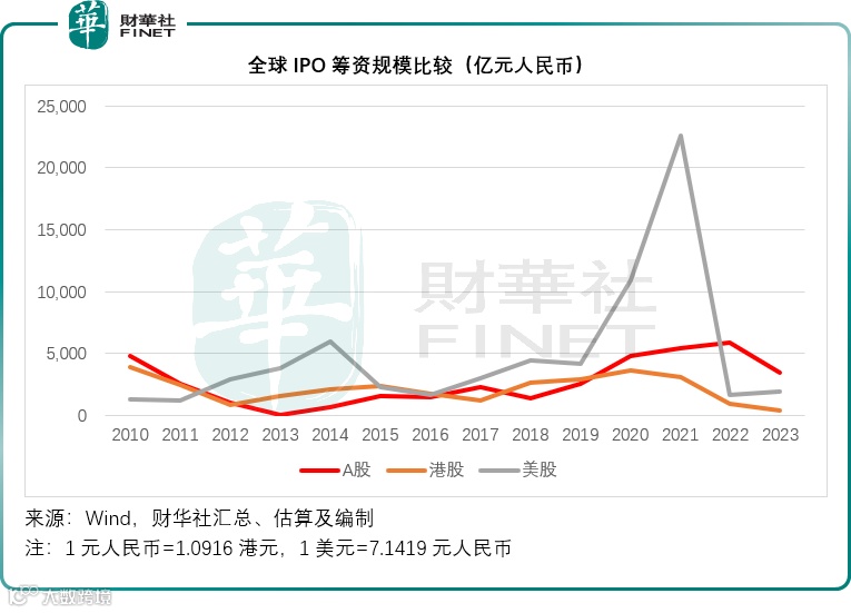 2023年A股总筹资额规模达到9,164亿元人民币,远高于美股的1,177亿美元,约合8,409亿元人民币,而港股市场的总融资规模仅相当于去年的一半。