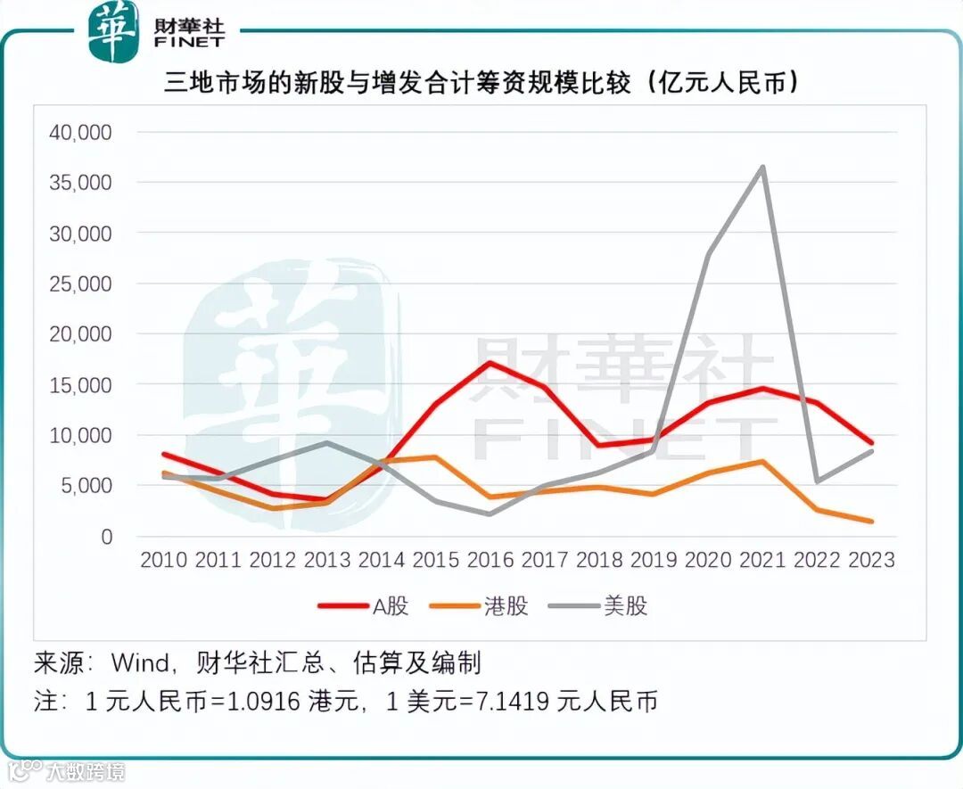 根据Wind数据,A股在2023年的增发规模为人民币5,667亿元,这一数字低于疫情三年每年的再融资规模。港股的再融资规模为1,111.09亿港元,折合人民币约为1,018亿元。而美股的再融资规模为910亿美元,折合人民币约为6,502亿元,稍高于A股的规模。