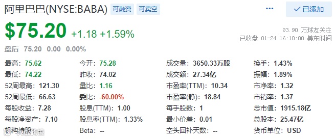 阿里巴巴(BABA)美股,继周二(1月23日)涨7.85%之后,周三(1月24日)又涨1.59%,目前市值1915.18亿美元。