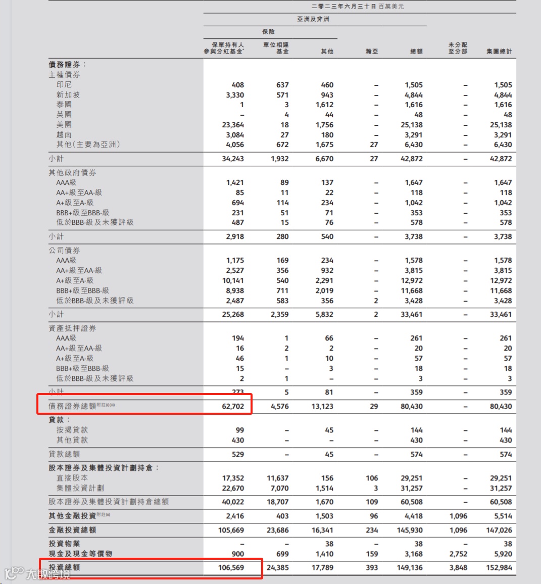 以保诚为例,根据2023年中报显示,该公司的亚洲及非洲保险分红业务金融投资总额为1065.69亿美元,其中主权债券、公司债券、资产抵押债券等债务证券总额约627.02亿美元,占比58.8%。而在主权债券中,美国主权债券占比最高,金额达到233.64亿美元。