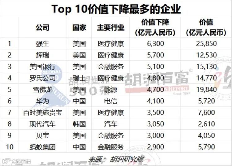 价值下跌最大的公司:强生和辉瑞分别下跌6300亿元和5700亿元。按百分比计算,跌幅最大的是韩国的现代汽车,下跌54%。