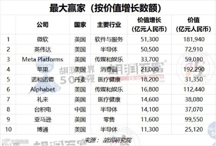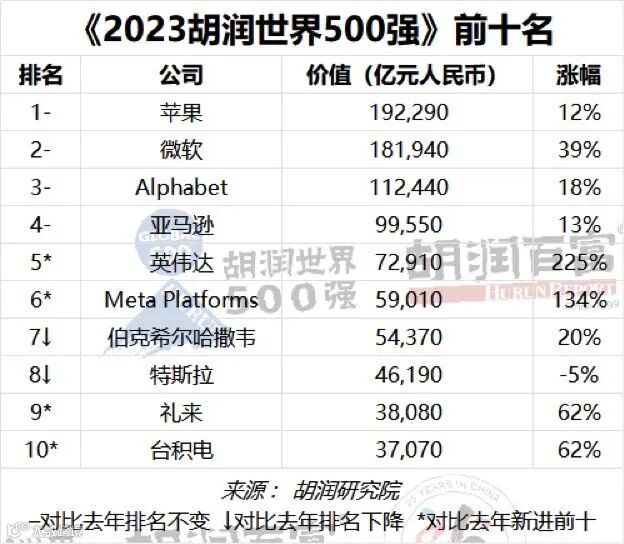 分企业来看,苹果以19万亿元价值蝉联世界上最具价值的公司,增长12%;微软以18万亿元排名第二,增长39%,即5万亿元,是今年最大涨幅;Alphabet排名第三,增长18%,至11万亿元;亚马逊排名第四,增长13%,至10万亿元;芯片制造商英伟达价值增长两倍多,成为全球第5家价值达万亿美元的公司。以上前“五大”总价值66万亿元,过去一年增加15万亿元。