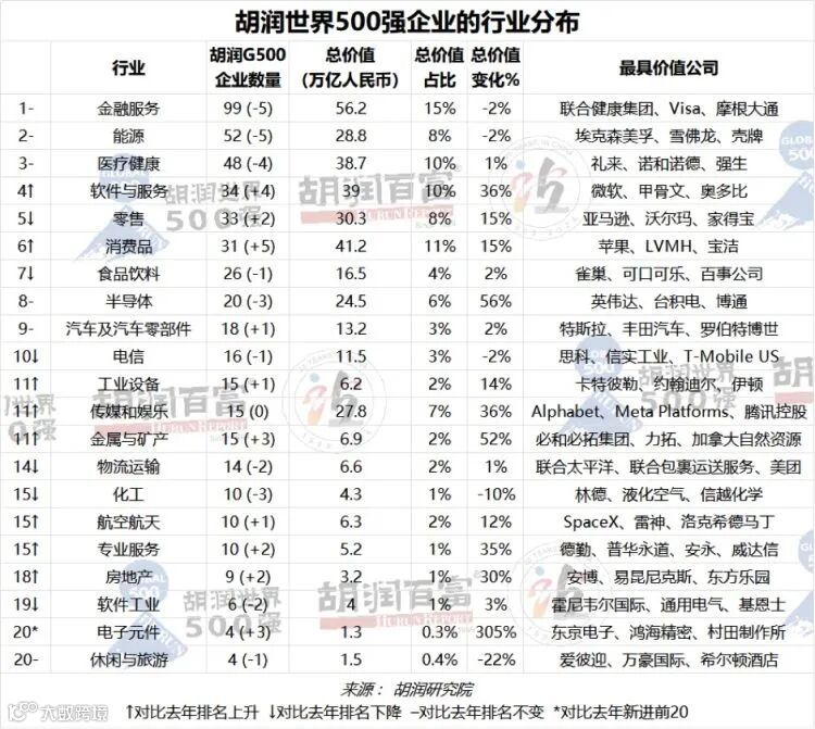 金融服务业仍然是胡润世界500强的最大贡献者,占20%,有99家公司上榜,减少5家,其中价值最高的是联合健康集团、Visa和摩根大通。
