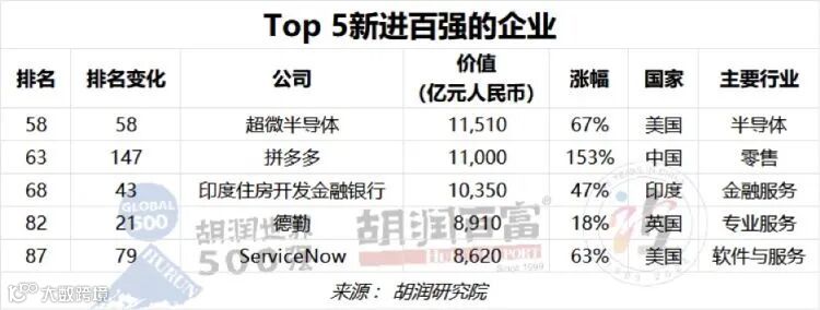 13家公司新进百强,其中以美国的超微半导体为首,上升58位,至第58位,其价值增长67%,达到1.2万亿元。