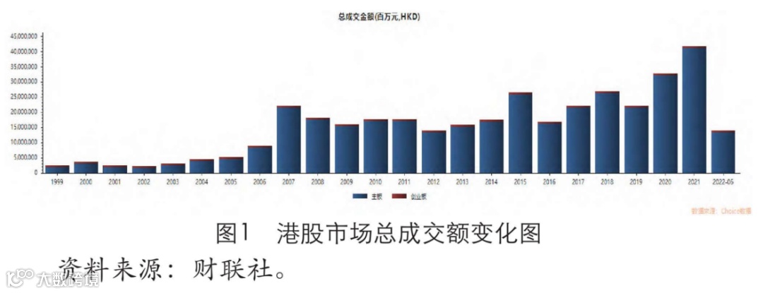 作为亚洲金融中心的香港,是仅次于纽约和伦敦的第三大金融中心。它不仅是中国的“门面”,更是连接中国内地与国际之间的桥梁。“十四五”规划、粤港澳大湾区建设等一系列战略规划中都赋予了香港重要角色。自香港回归以来,上市公司总数一直保持稳定的上升趋势,从1997年的597家上升至2022年中的2875家,升幅超过三倍。截至2022年4月,内地企业在港上市总数上升到1370家,占到港交所上市企业总数的一半以上。由此可见,内地产业为香港金融业的成长壮大提供了强大的活力源泉。图1为自1999年以来港股市场成交额变化,不难看出成交额总量一直呈现上升趋势,且在2007年取得巨大突破。