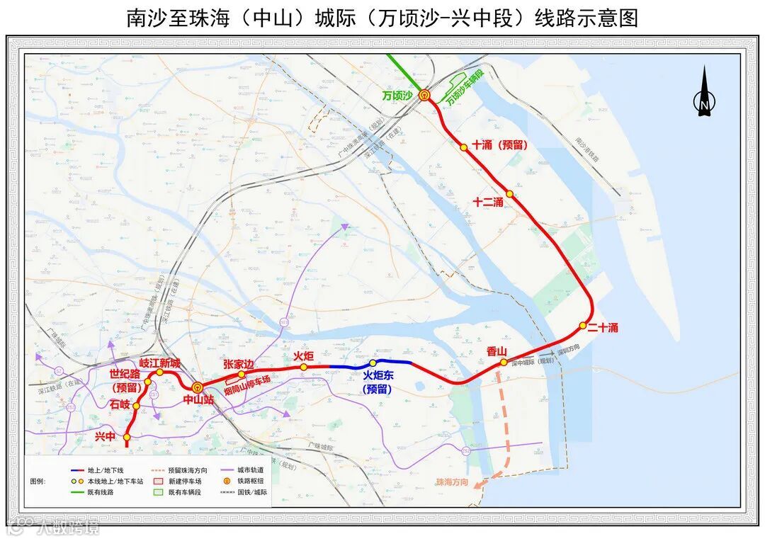 根据此前广东省交通运输厅发布的对新建南沙至珠海(中山)城际万顷沙至兴中段项目初步设计的批复,线路将采取“快慢车”与“长短线”的运营模式。