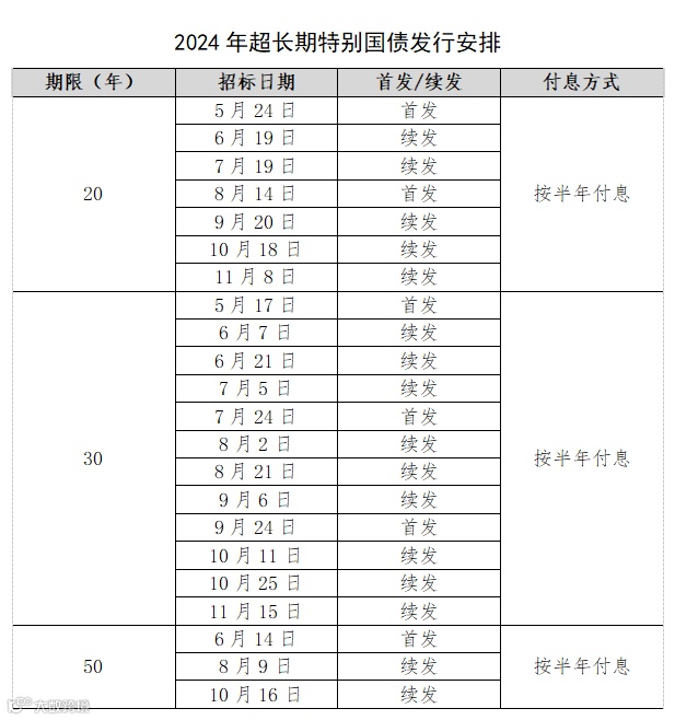 从整个1万亿元超长期特别国债发行安排来看,国债发行期限分别为20年、30年和50年,发行次数分别为7次、12次和3次,目前尚未公开具体每次发行金额,付息方式均为按半年付息,发行时间分布在5月中旬至11月中旬。