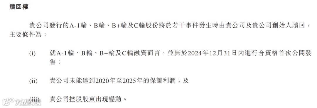 在招股书中,声通科技提到,其发行的A-1轮、B轮、B+轮及C轮股份将在若干事件发生时,由公司及创始人赎回。而上述若干事件包括:未能在2024年12月31日内进行合资格首次公开发售;未能达到2020年至2025年的保证利润;控股股东出现变动。