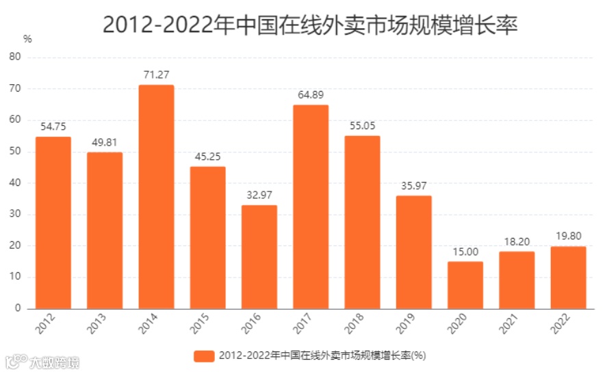 据艾媒咨询数据显示,2018年中国在线外卖市场规模增长率为55.05%,2019年中国在线外卖市场规模增长率为35.97%,2020年中国在线外卖市场规模增长率为15.00%,2021年中国在线外卖市场规模增长率为18.20%,2022年中国在线外卖市场规模增长率为19.80%。从近三年来看,市场增速明显放缓。