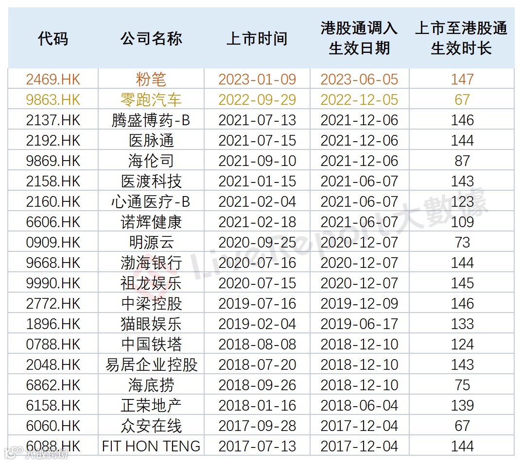 历史上,通过季度快速纳入机制进入港股通的股票有19只,分别为粉笔、零跑汽车、腾盛博药-B、医脉通、海伦司、医渡科技、心通医疗-B、诺辉健康、明源云、渤海银行、祖龙娱乐、中梁控股、猫眼娱乐、中国铁塔、易居企业控股、海底捞、正荣地产、众安在线、FIT HON TENG。