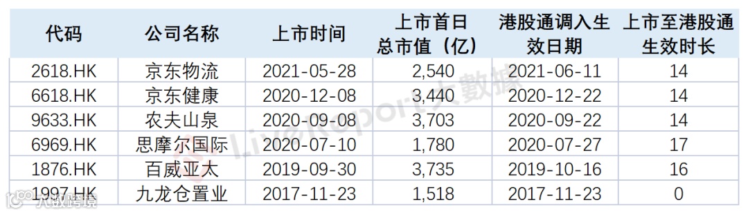 历史上,通过特别快速纳入机制成为恒生综合指数成分股并进入港股通的股票有6只,分别为京东物流、京东健康、农夫山泉、思摩尔国际、百威亚太、九龙仓置业。相关公司于上市首日的总市值均超过1500亿港元。