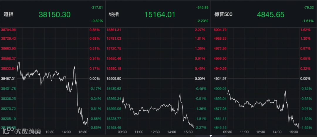 鲍威尔的这番表态,给美股市场“泼了一盆冷水”。在其讲话结束后,美股三大指数大幅跳水,道指盘中最大跌幅达449点,纳指跌幅最大,盘中一度大跌2.27%,截至收盘,标普500指数跌1.61%,道指跌0.82%,纳指大跌2.23%。