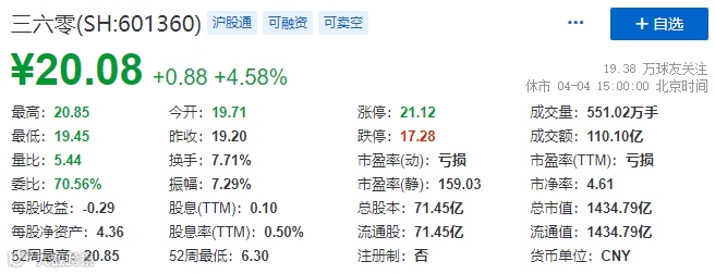 4月4日晚间,三六零(601360.SH)公告,公司实际控制人、董事长周鸿祎与胡欢经友好协商,已办理解除婚姻关系手续,根据周鸿祎与胡欢签订的《离婚协议书》,周鸿祎拟将其直接持有的公司4.47亿股(446,585,200股)股份分割至胡欢名下,约占三六零总股本的6.25%,以三六零4月4日收市价20.08元计,上述股权市值约89.67亿元。
