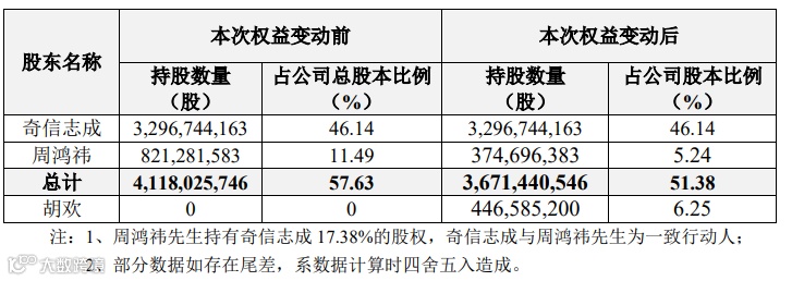 本次权益变动后,周鸿祎直接持有公司3.75亿股股份,约占公司总股本5.24%(剔除回购专用账户中的股份数量后的比例为5.35%),通过天津奇信志成科技有限公司(“奇信志成”)间接持股46.14%,合计持股51.38%。本次权益变动后,公司控股股东仍为奇信志成,实际控制人仍为周鸿祎,二者互为一致行动人。