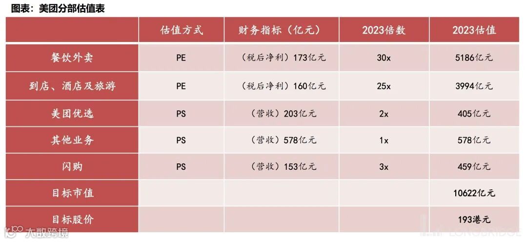 分业务看,预计美团 2023 年餐饮外卖和到店酒旅税后净利润分别为 173 亿和 160 亿,对应 30x 和 25xPE 估值,分别对应 5186 亿和 3994 亿市值;优选、闪购、其他业务采用 PS 估值,分别赋予 2x、1x、3x 估值,合计目标市值 10622 亿人民币,合目标价 193 港元。