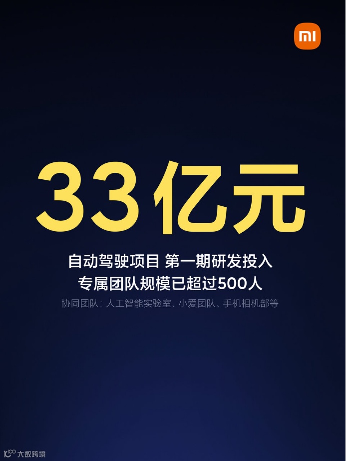 同时,他还透露了小米造车的投入情况以及未来目标。“小米在自动驾驶第一期投入33亿元,专属团队规模已超过500人。第一期规划140辆测试车,将陆续在全国进行测试,目标是2024年进入行业第一阵营。”
