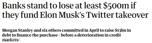 外电报导,以摩根士丹利为首、包括美银、巴克莱、三菱日联金融集团在内的6家投行,同意就马斯克收购Twitter的交易,合共提供130亿美元融资。这些投行更已承诺,不论能否找其他投资者接手,都会提供融资。然而,分析指上述投行几乎不可能在该宗收购完成前,成功向投资者出售与交易相关的债券及贷款。